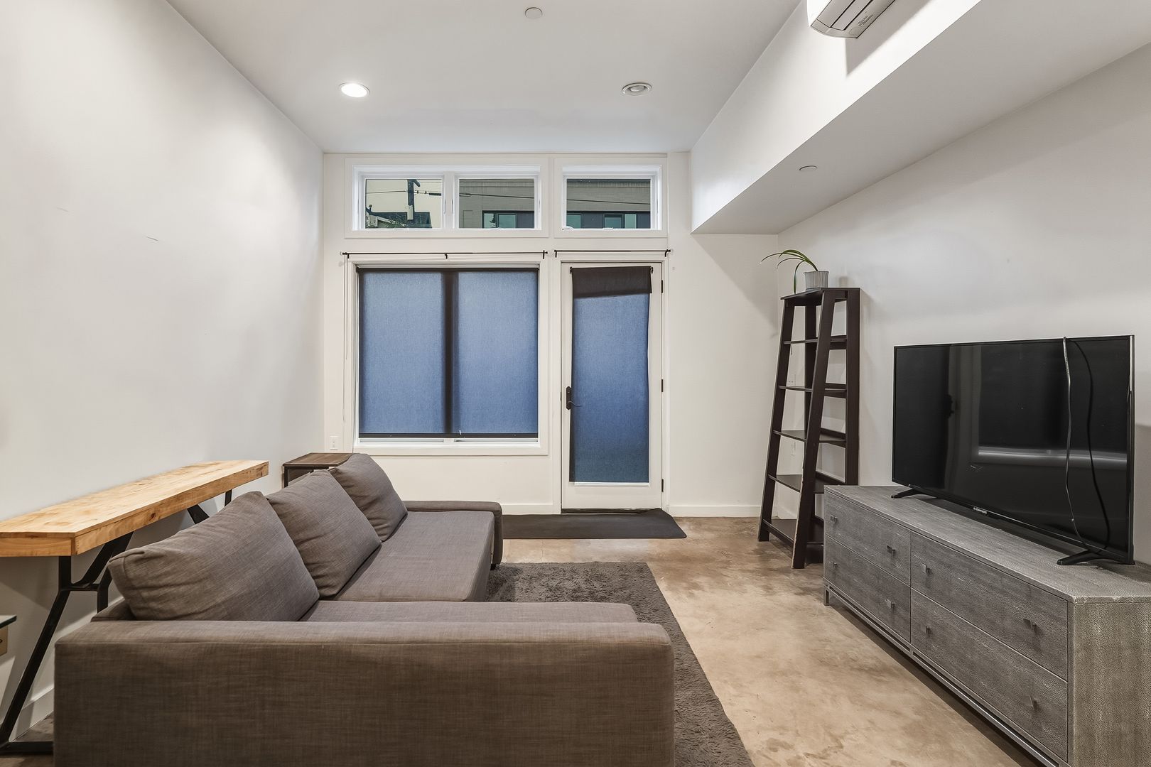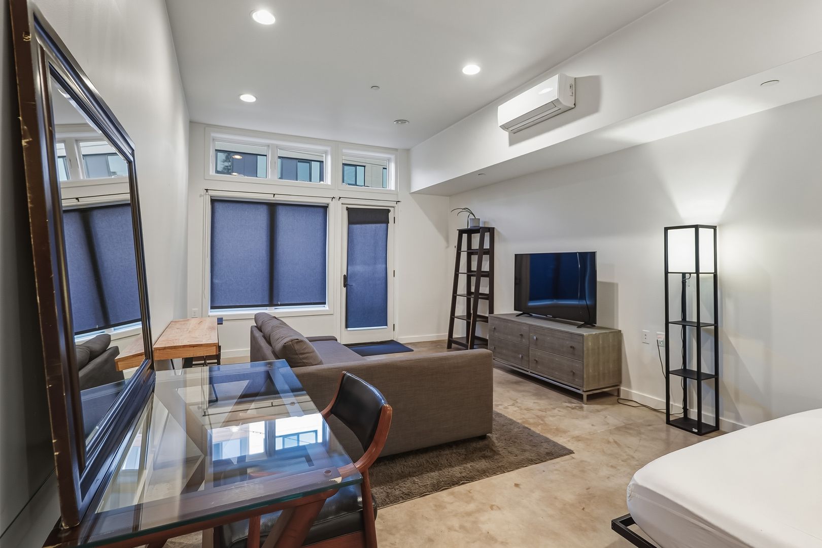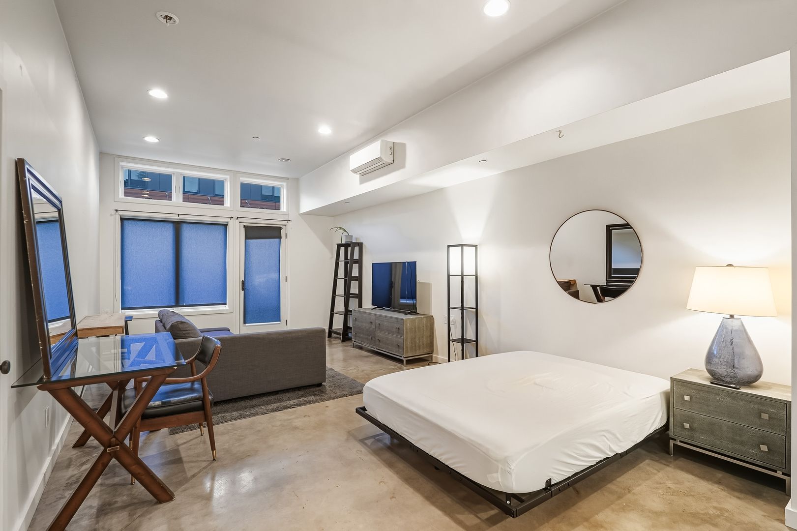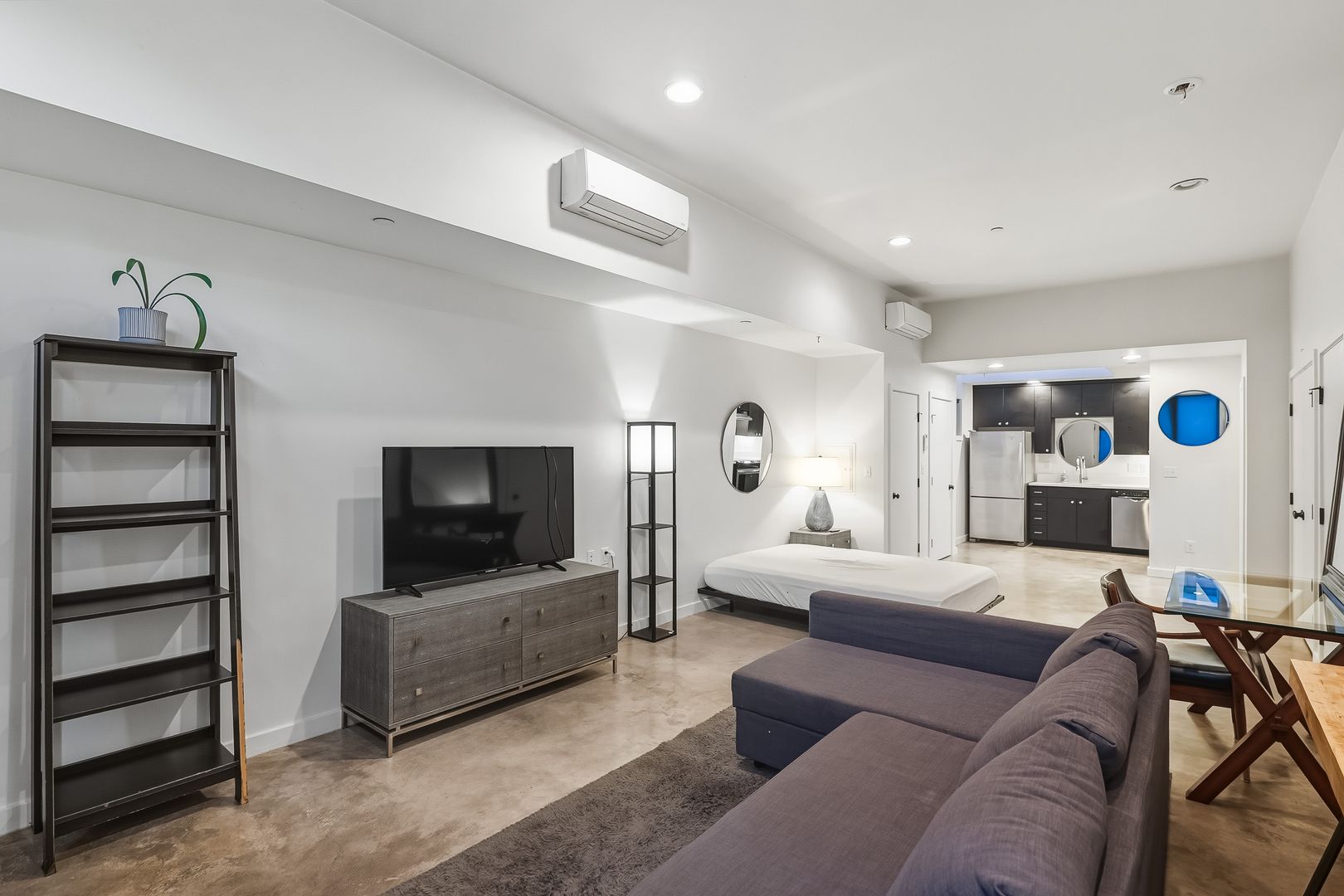 Inside, you’ll find sleek concrete floors, energy-efficient heating and cooling, and an open layout designed for easy living. The stainless steel appliances add a high-end touch to the kitchen, while the in-unit washer and dryer deliver everyday convenience. Thoughtfully furnished pieces help create a move-in-ready experience without sacrificing your personal style.