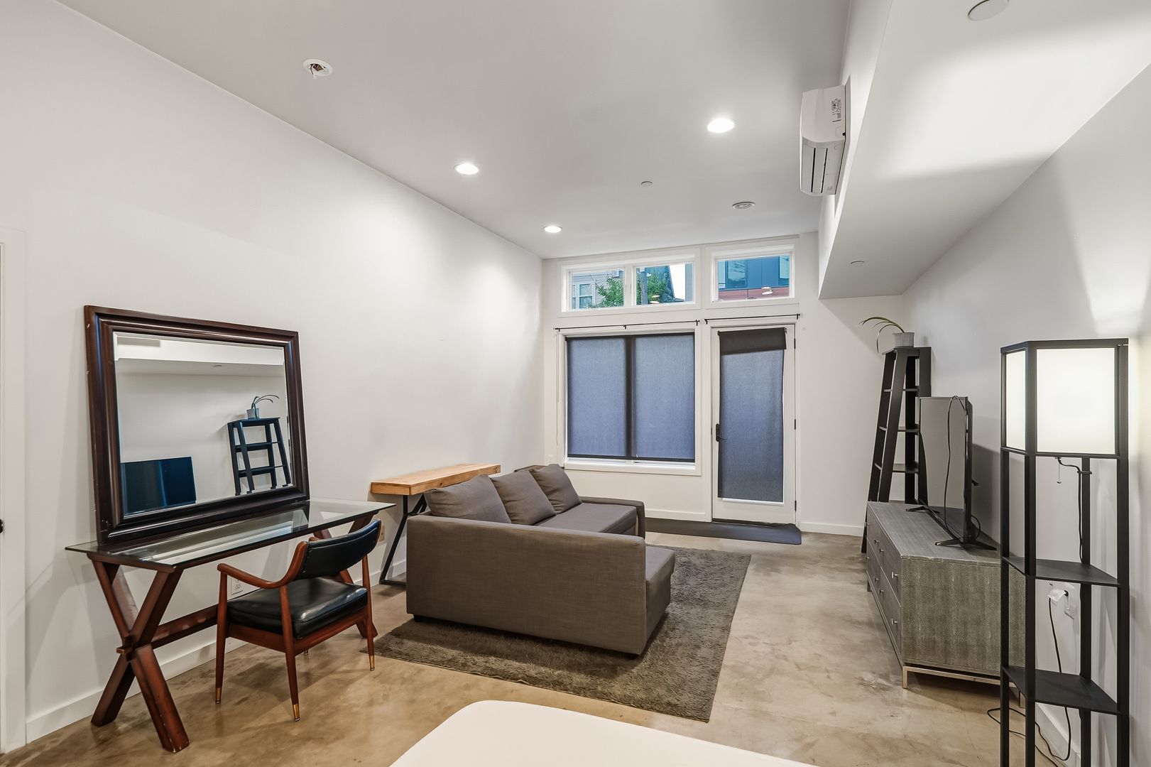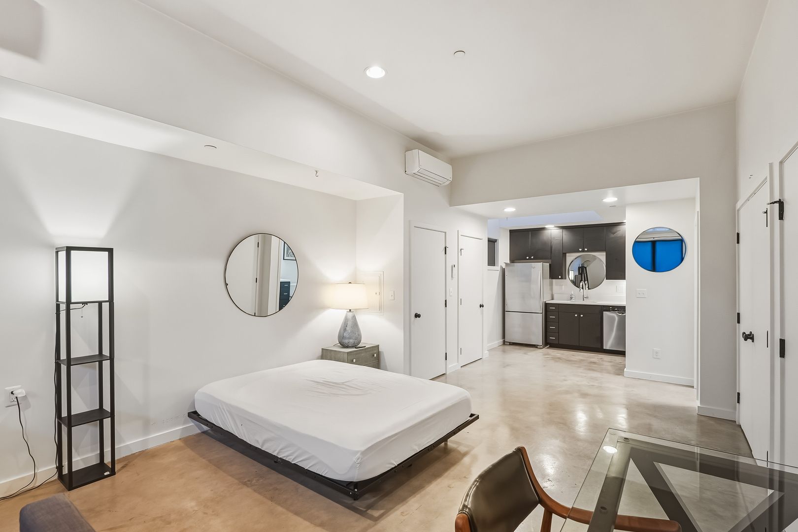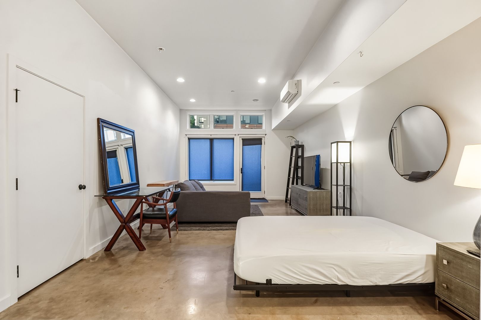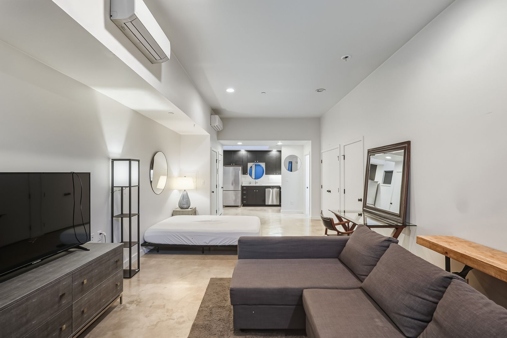 Inside, you’ll find sleek concrete floors, energy-efficient heating and cooling, and an open layout designed for easy living. The stainless steel appliances add a high-end touch to the kitchen, while the in-unit washer and dryer deliver everyday convenience. Thoughtfully furnished pieces help create a move-in-ready experience without sacrificing your personal style.