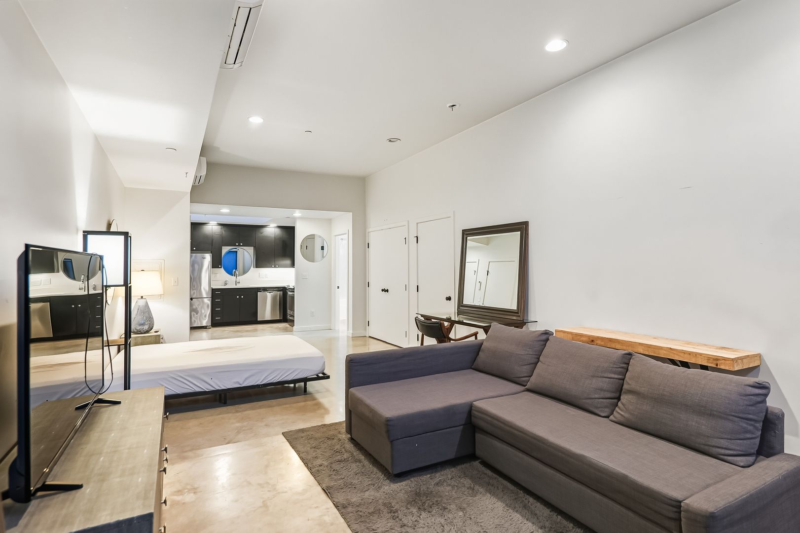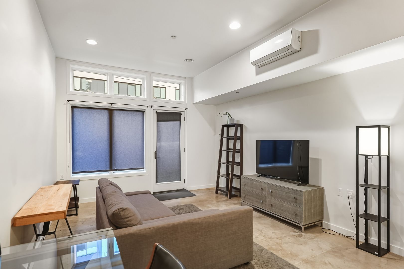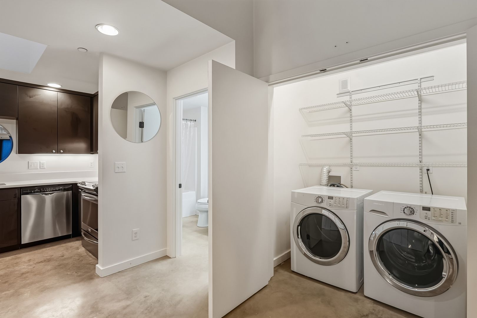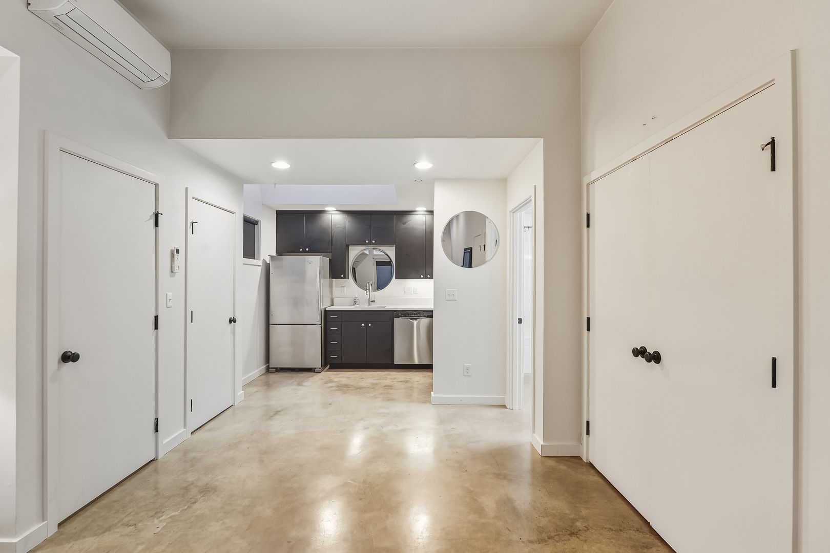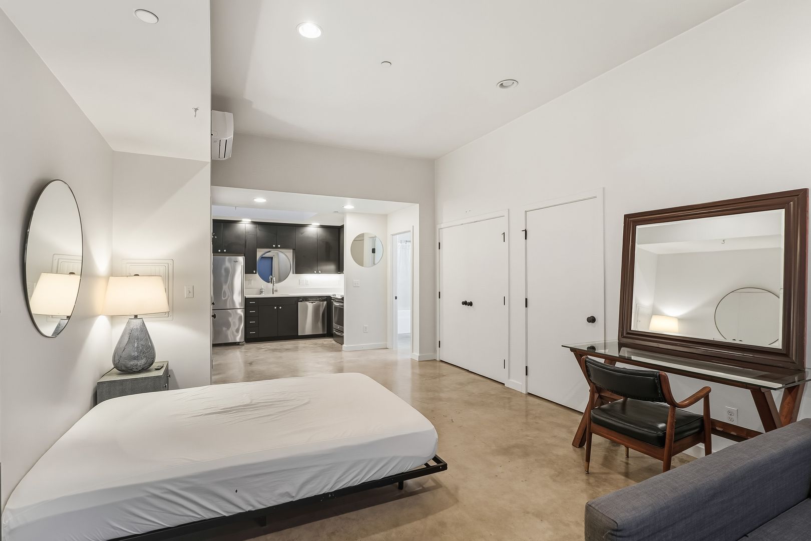 Inside, you’ll find sleek concrete floors, energy-efficient heating and cooling, and an open layout designed for easy living. The stainless steel appliances add a high-end touch to the kitchen, while the in-unit washer and dryer deliver everyday convenience. Thoughtfully furnished pieces help create a move-in-ready experience without sacrificing your personal style.